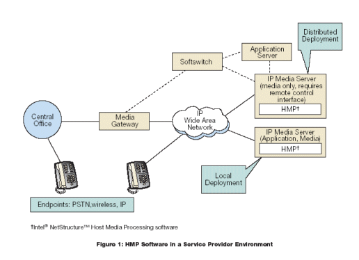 圖1表示使用HMP軟件的IP媒體服務(wù)器,部署在典型的服務(wù)提供商環(huán)境的例子,包括IVR,通告,語音郵箱/消息,語音識別和會議服務(wù)器。