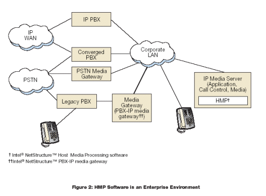 圖2表示使用HMP軟件的IP媒體服務(wù)器,部署在企業(yè)環(huán)境的例子,包括IVR,自動應(yīng)答,語音郵箱,統(tǒng)一消息,語音識別和會議服務(wù)。
